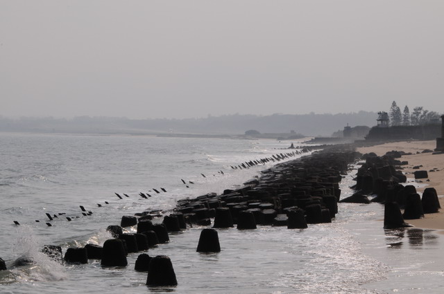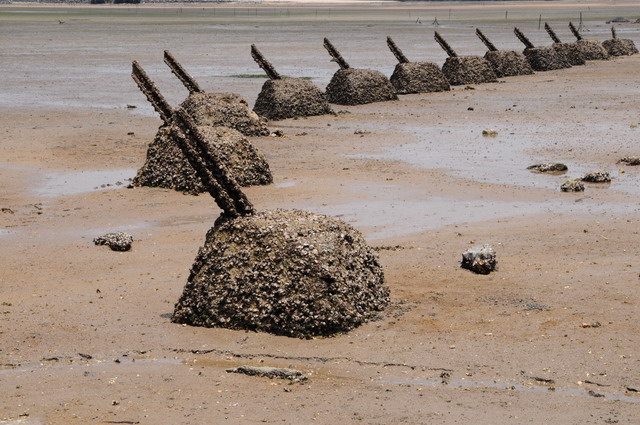 退潮時,當海水逐漸退去,距離海岸不遠處一節節長滿牡蠣的鐵樁便顯露出來,這叫作「軌條砦(ㄓㄞˋ)」,是金門海濱軍事的阻絕措施之一,也稱之為「反登陸樁」,這也算是戰爭遺跡了。(攝於建功嶼步道)。