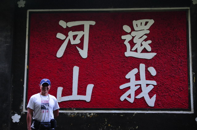 今日的金門已經看不到幾分戰地氣氛,但處處還看得到當時所留下來的精神標語及反共口號。瞧,精神奕奕的阿舍站在「還我河山」旁邊。現在,讓我們用想像力來把阿舍變裝:把他的棒球帽換成蛙鏡,剝掉他的T-shirt露出他古銅色厚實的胸膛,海灘短褲換成紅色小褲頭,再把腰包換成S腰帶,小腿肚上再繫上一把水手刀,若臉上再塗上迷彩,這時候,他,像不像一位兩棲偵察連的蛙人呀?(攝於馬山觀測站前)