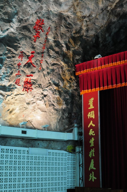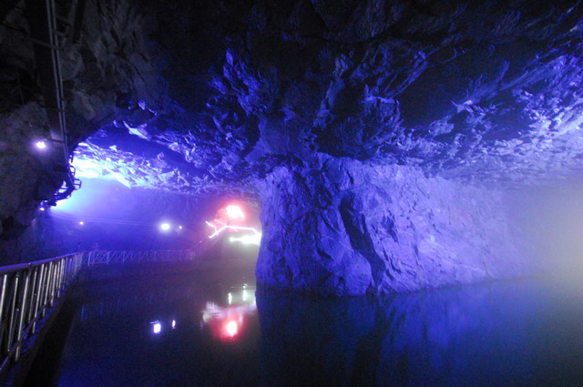 翟山坑道,另一個地下坑道的傑作。炮戰期間灘頭運補經常受到中共炮火的威脅,國軍才開鑿這條堪稱鬼斧神工的海上運補坑道。這條水道長357公尺、寬11.5公尺、高8公尺,呈A字型,可容納42艘水道小艇進出、迴轉,是個規模極大的工程。(攝於翟山坑道)