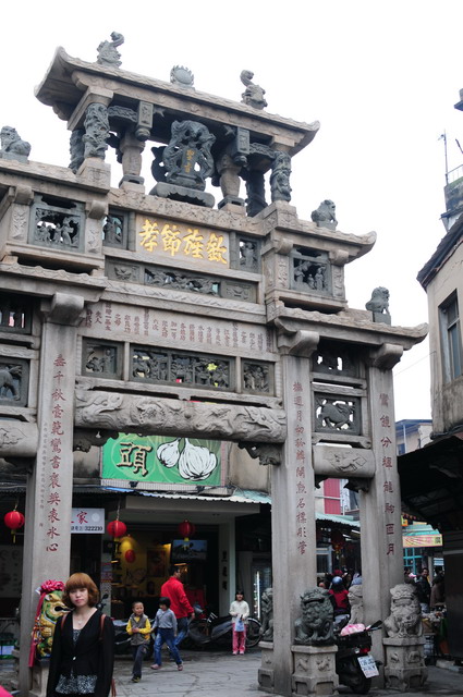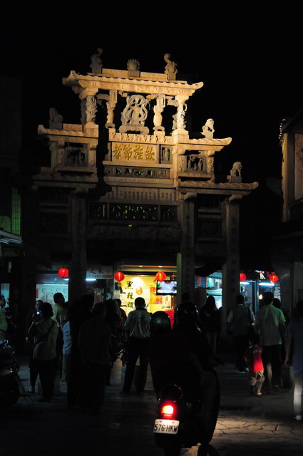 旅遊書上都說參觀的最佳時間是傍晚,柔和的光線可以清楚地顯現此牌樓的四柱三間、五樓三層各個精雕細琢的部位,在月夜裡,市井俗麗的街燈更對比反應此牌坊的貞潔堅毅。