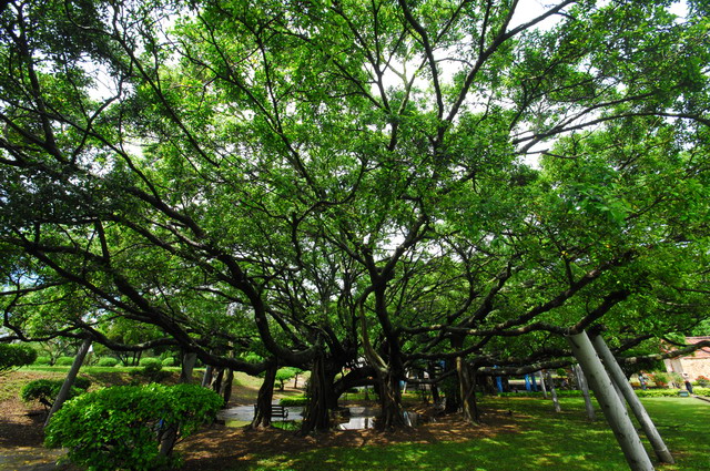 榕園內的老樹,株株氣根壯如主幹,開成一朵朵翠綠的大傘。行在其間,在綠蔭下享受午後的清涼,令人想坐下來、飲口茶、再下盤棋。