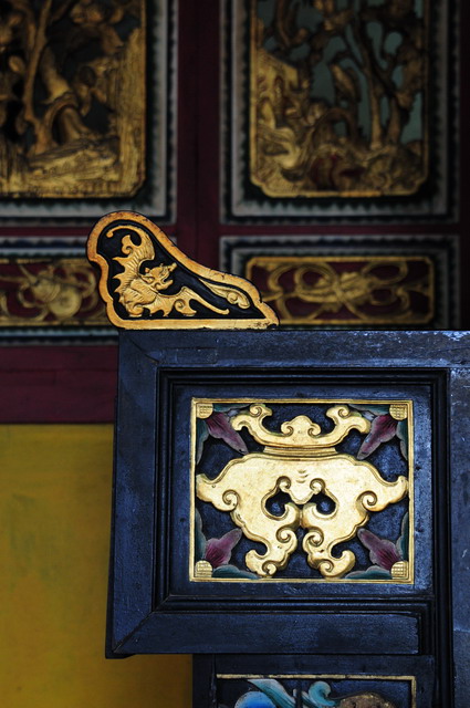 香案的一角和背後精美的木雕,廟裡的陳設莊嚴肅穆之中又透出微些的富麗堂皇。