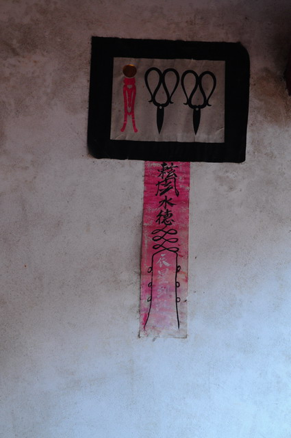 大魏特別指給我們看廟牆上這張非常特別的「剪刀符」。這張符紙之上有二支剪刀,剪刀的開口向下,旁有一瓶,瓶上有個圓球,其四周有黑色紙包著。大魏為我們解碼,她說:這「剪刀符」上有二支剪刀、瓶子及圓球,其意為「家家平安團圓」之意。(同閩南語發音)