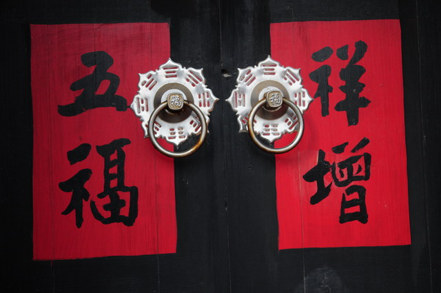 門環上有個八卦,八卦上再添個「囍」字,好有古意。(攝於珠山聚落)