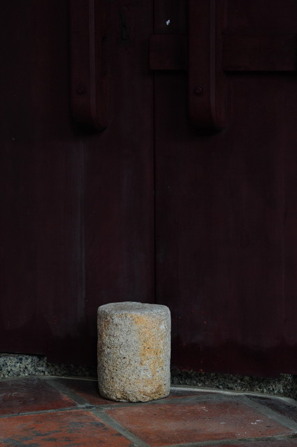 一塊蒼老圓潤的泉州白石擱置在色澤渾厚的木門前當作門擋,深沉而穩當。(攝於珠山聚落,來喜樓內)