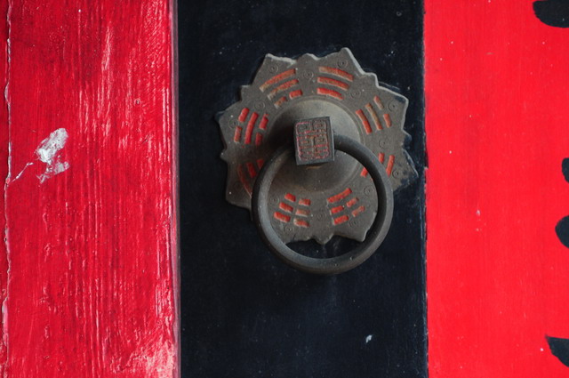 傳統聚落中常見的門板上的一對扣環,扣環的底部有個八卦,八卦用來鎮邪避災,而八卦上又有個雙喜,雙喜用來祈福。鎮邪與祈福是閩式建築裝飾上兩個很重要的元素。