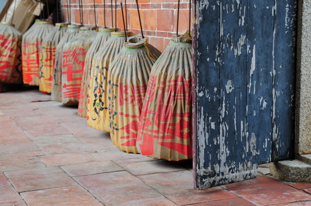 幾具被擱在地上,已陳舊不堪的姓氏燈或女婿燈,其上除了有“蔡”字之外,還可辨識出燈籠也寫上“濟陽”的字樣。