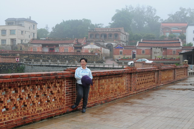 麗真所倚靠之處即為大潭邊上的矮牆,珠山的建築不同於其他聚落,沒有單一朝向(如瓊林),卻以宗祠為中心,環繞在緩坡四周,共同面向中間大潭。我們頭二夜就住在珠山的“來喜樓” 又叫薛永南兄弟洋樓。即麗真後方,最後一排三棟樓房中的中間那棟。