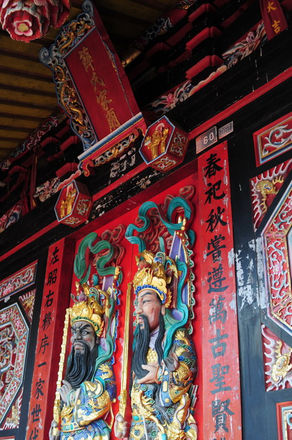 這家廟最引人注目的是它精緻細膩的裝飾,其中正廳大門上表面立體突出的門神是金門所僅見,非常特別。