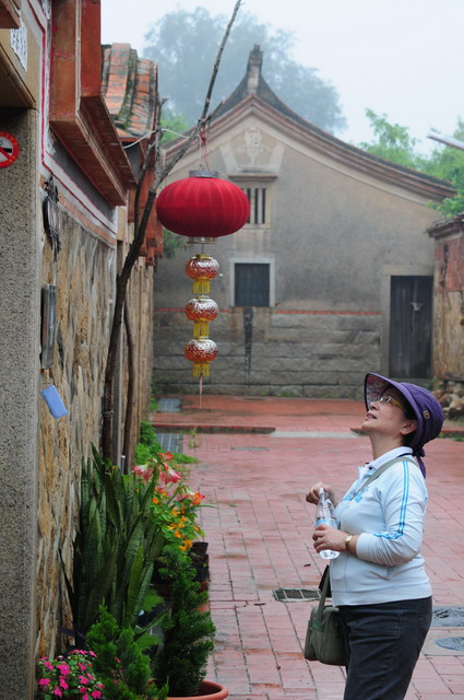珠山聚落為傳統閩式建築,以紅色磚塊鋪地,聚落內主要的宅第有:頂三落、大夫第、將軍第、薛芳見洋樓、薛永南兄弟洋樓等。麗真正在欣賞一處民宅的建築裝潢。