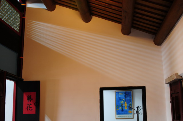 午後的斜陽照射進來,透過窗格,在二樓的廂房牆上形成了有趣的光影圖像。