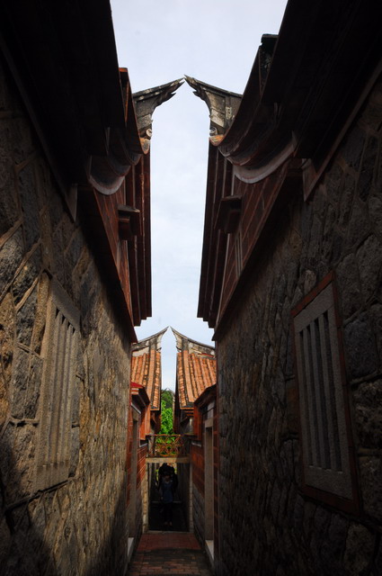 可聽說過「鉤心鬥角」這句成語的典故?據說秦始皇所建的阿房宮,華屋連連,所有的屋脊都相交勾結,因而有此形容詞的出現。在山后聚落,這裡的建築也有這般的味道。兩棟屋子之間兩兩成對的高聳翹脊,讓聚落的天際線宛如畫入藍天中的一道道優美的曲線。