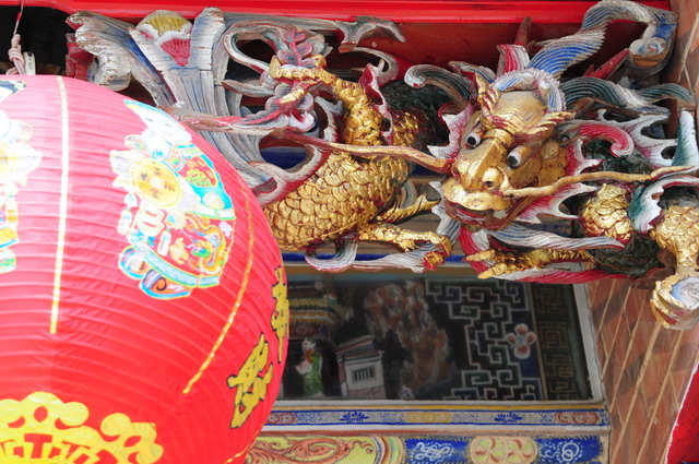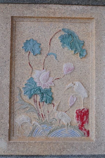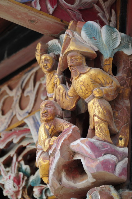 王氏宗祠廊牆上有許多片彩繪浮雕,除了祈福避邪之外亦多具勵志吉祥的意涵,例如這一塊,刻上了鷺鷥與蓮花,鷺與路同音、蓮與連同音,鷺與蓮寓意“一路連登”,且又是三朵蓮、三隻鷺,三更代表“多”的意思,故寓意子孫們多一路連連登科。經過一趟像印地安納瓊斯一般的浮雕解碼(decipher)我也給自己上了一課。