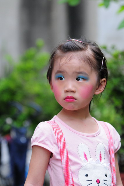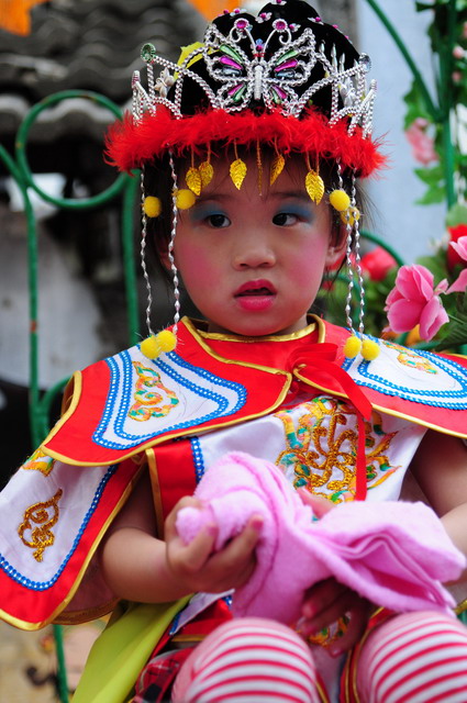 此刻的她被她媽媽要求必須乖乖坐好,不可以隨便亂動而亂了臉上的妝,原來小仙女化妝是要參加下午的遶境遊行。怪怪!真難以置信,連小小年紀的她,廟會的活動居然也有她的一份。她參與的項目是「花車」踩街。