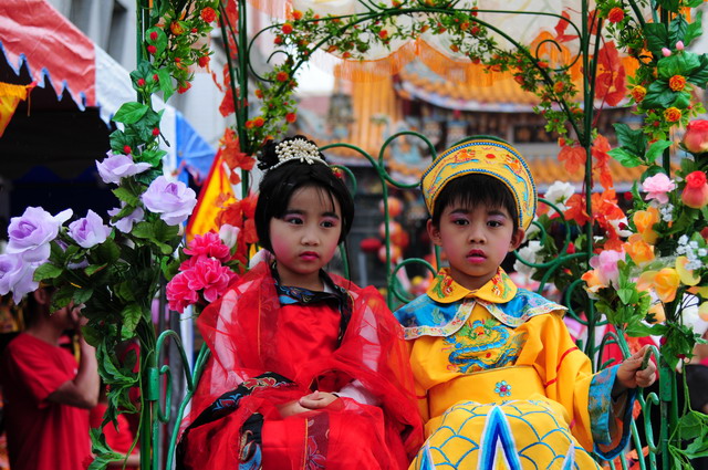 吃過中飯,先到大魏家所隸屬的東門境主的所在地---代天府,去看看,果然在花車群中見到了大魏的小孫姪女,此時她已完全妝扮好,正襟端坐在花車上,可能是第一次參加,她似乎有些兒不自在,好心的大魏大哥在一旁像褓母般不停的在安撫她。