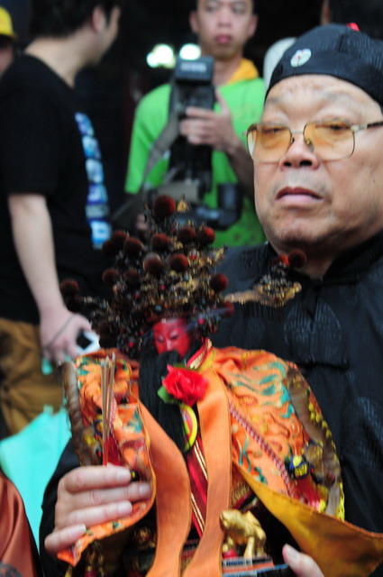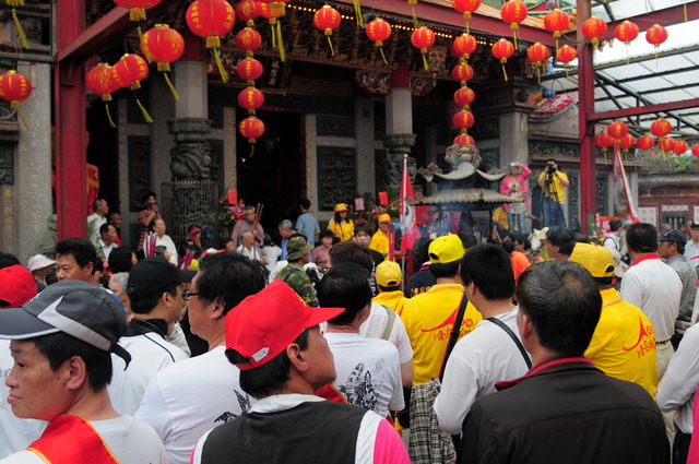 在廣場上想為自己找一處利於拍攝城隍爺起駕的好位置,但不可得,我必須不停的移動,因為一直有從各地前來的神明要謁見城隍。每一組陣頭上來時,負責管理秩序的人員都會驅趕好奇的觀望者,或那些既礙事又屢勸不聽的好攝者(我即是其中之一),好讓神轎能有足夠的空間去行禮。