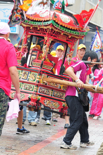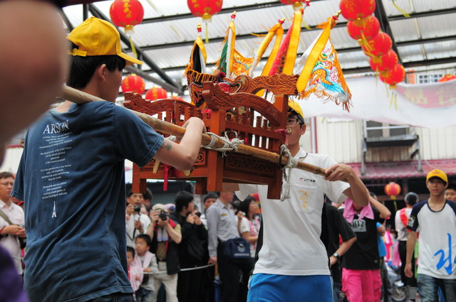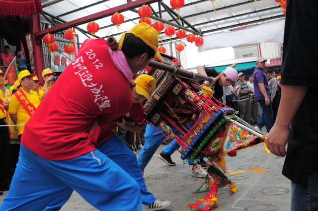 進來的神轎,行動起來無不劇烈的上下搖晃、左右搖擺。扛輦者以肩搖神轎,並常會同步使勁,用力搖晃,好像若沒使出全力,就沒充分表達出對神明最高的崇敬。有時候擺蕩的幅度過大,連扛輦者都難以控制自己身體的重心而使得腳步踉蹌,幾乎要撞入人堆裡,險象環生在所難免,但也顯示出人扛神轎的生動與活力。