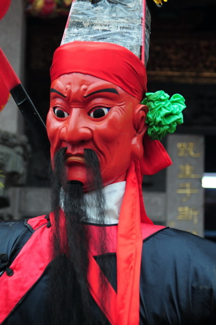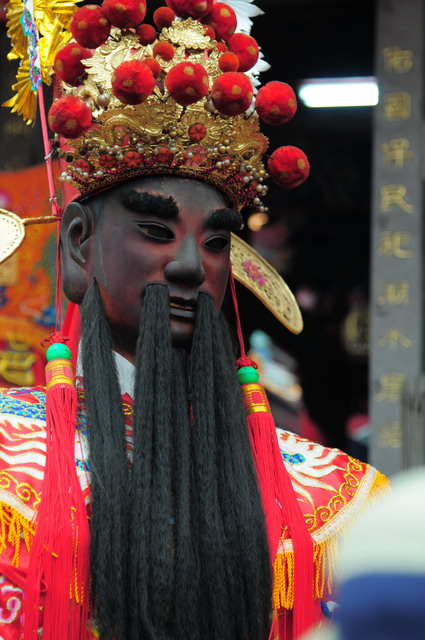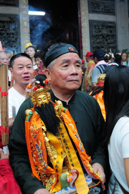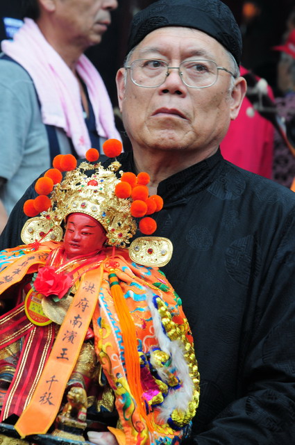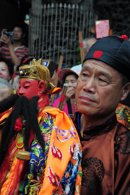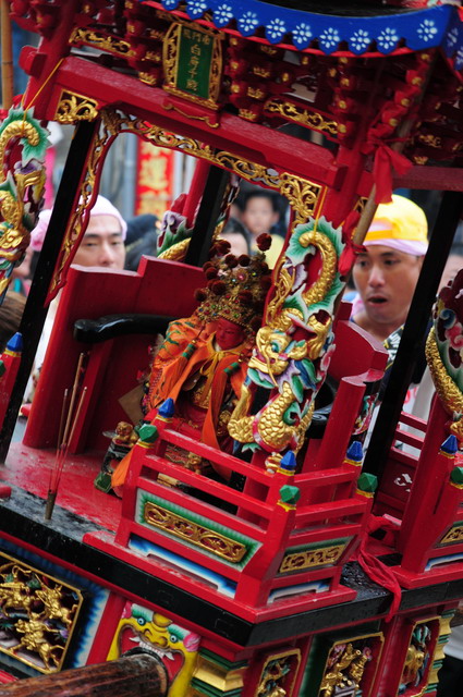 近一點半,正式起駕的時間就要到了,我找到一處台階,稍為可以將我墊高以避開洶湧的人潮。首先步出城隍廟的是城隍的行政幕僚、部屬等神,例如七爺與八爺,文、武判官,董排爺與李排爺等,接著是金城四境的境主。四位境主的神座分別由四位德高望重、穿著長袍馬掛的鄉紳父老捧出來。