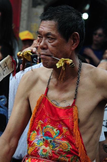 在迎神賽會中,最引人注目的就是乩童,特別是在巡行繞境或者遠道進香的隊伍之中,在炮聲硝煙、鑼鼓喧天的陣仗裡,無數的乩童夾雜在善男信女中間,下身是清一色的燈籠褲,上身或赤膊或僅圍一件刺繡鑲亮片珠子的肚兜,手執各種奇門的短打兵器:鯊魚劍、流星錘、狼牙棒、短劍、九環刀、銅金間鋼鞭,或三稜刺的,不論武器為何,動作則幾乎是大同小異;誇張和略嫌機械化的步伐,眼神半睜半閉,神情肅穆冷峻,一面前行,一面不停的將手中的兵器往自己身上砍,多半是背上,偶爾也有以肚皮或左右腰身脅下為標的的。雖說神明護體,但鮮血淋漓卻是免不了,常見乩童一路往自身砍斫前進,後面有個人則含著一口口的米酒,往乩童的背上傷處猛噴。