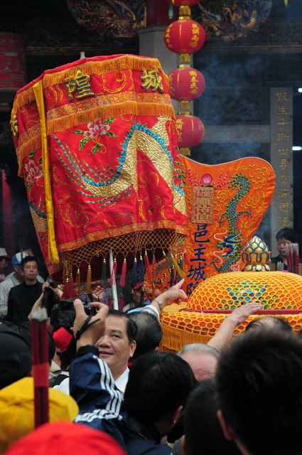 最後,近一點五十分,城隍爺的鑾駕終於在千女散花(滿天的祈福金紙)之中出現在眾人的眼前。鑾駕一出,千百隻手舉起,千百隻手機卡嚓、卡嚓地響個不停,大家都不肯放過這個鏡頭。城隍爺的鑾駕,很明顯的是個「文轎」。