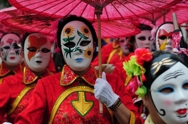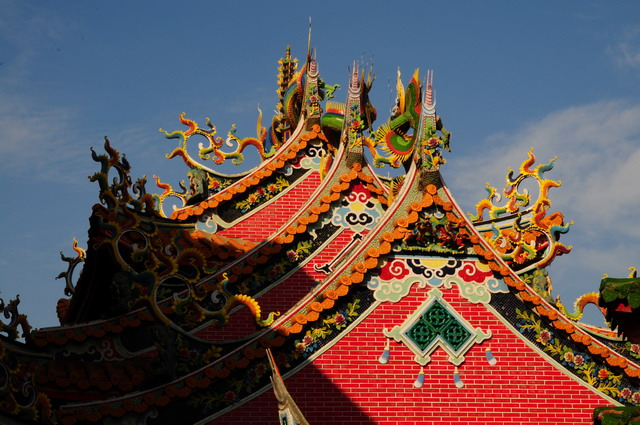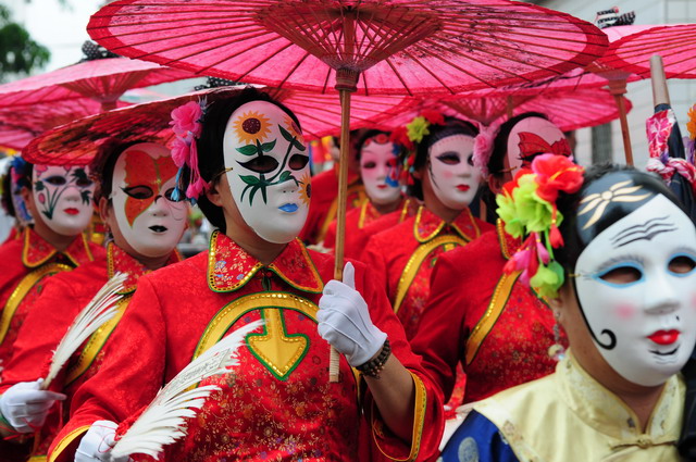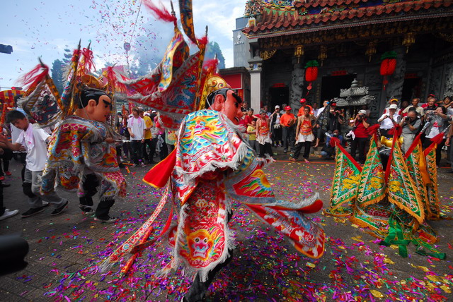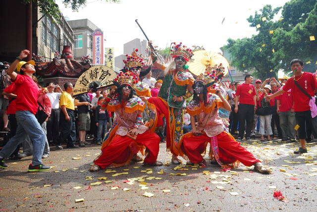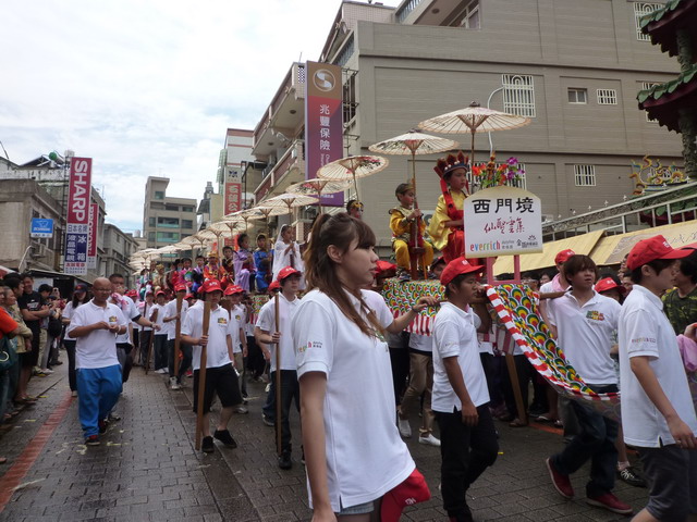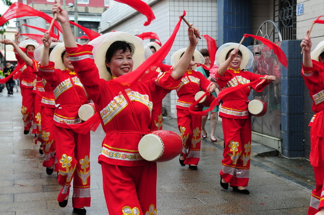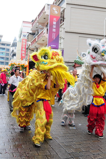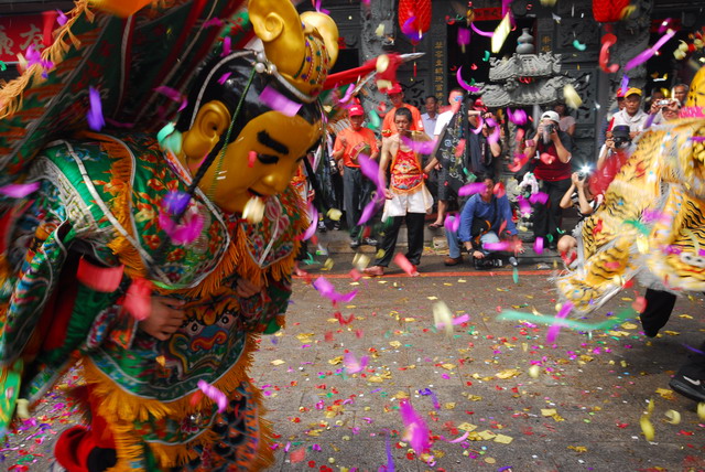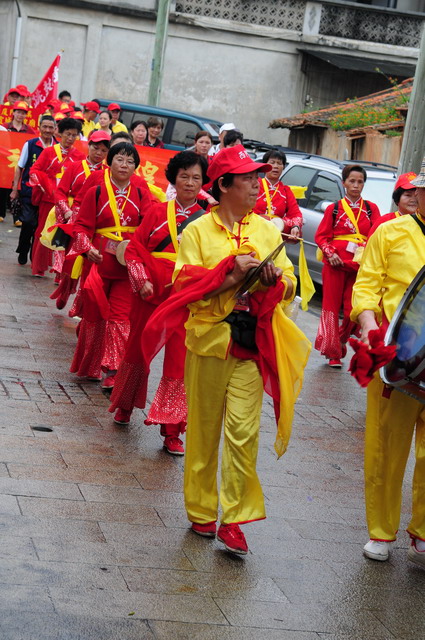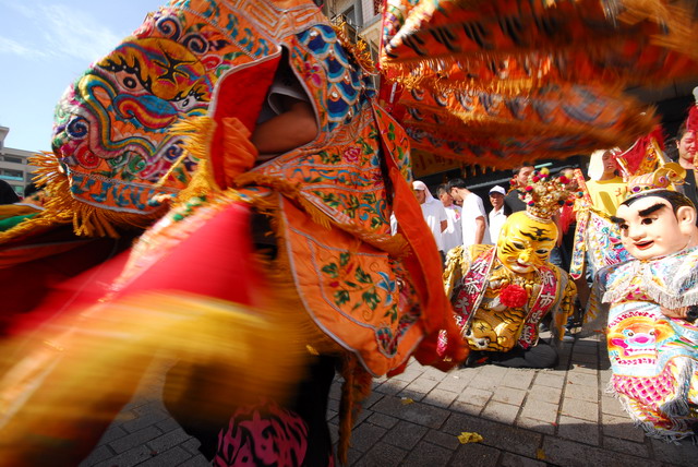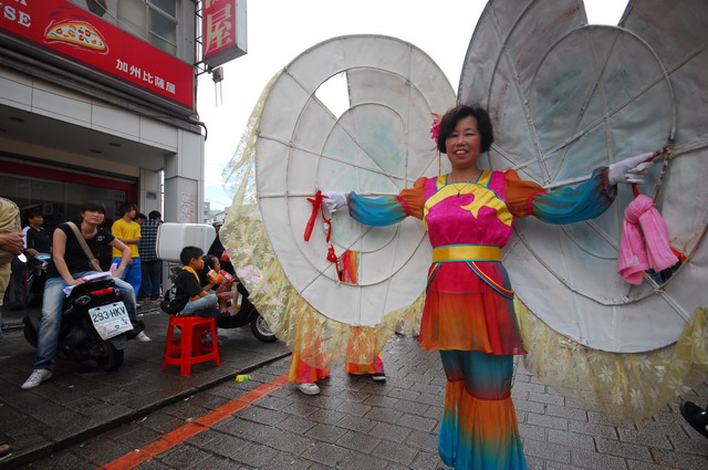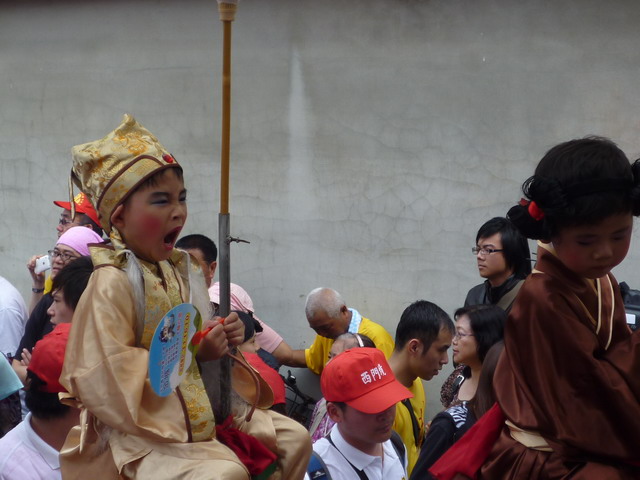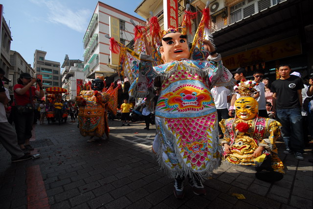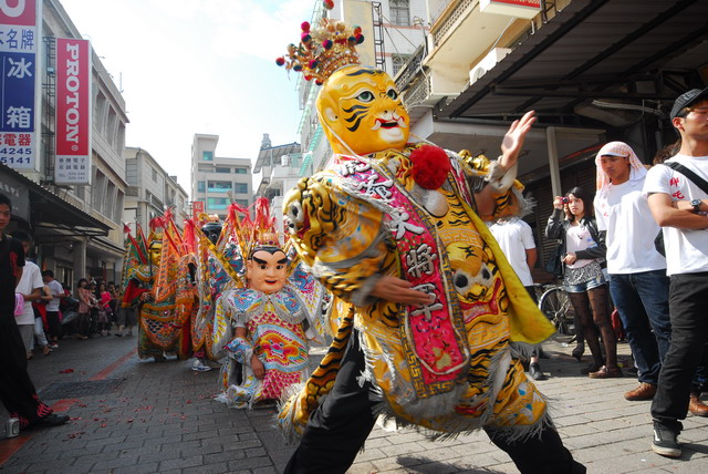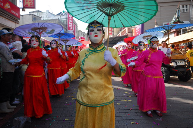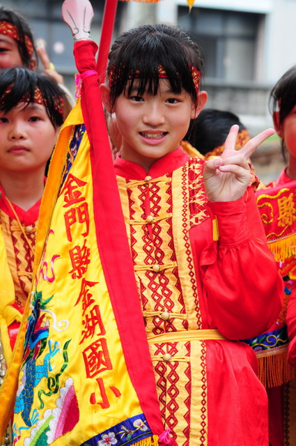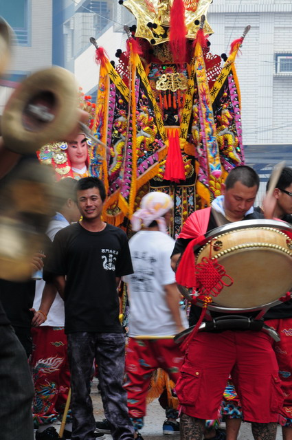 我跟著隊伍一邊拍照、一邊欣賞這有如嘉年華會般的遊行隊伍。隊伍中不但四境間彼此的陣頭組合不同之外,還夾雜著不少來自大陸各地的鑼鼓隊和表演隊伍,都有特色。陣頭裡有綵帶、旗幟、大鑼、南管、香燈、香擔、十音、鑼鼓陣、小獅隊、舞龍隊,以及來作客的開浯恩主公神駕、關帝爺神駕、天上聖母神駕等等,真是熱鬧滾滾!