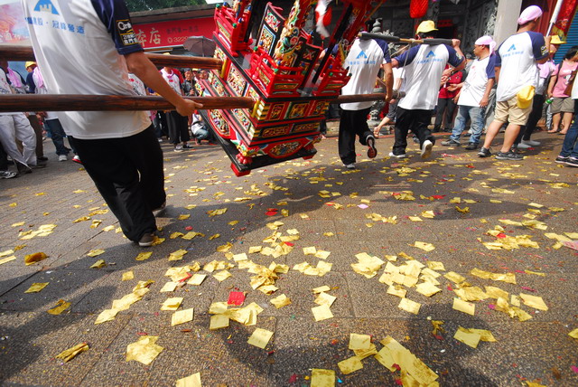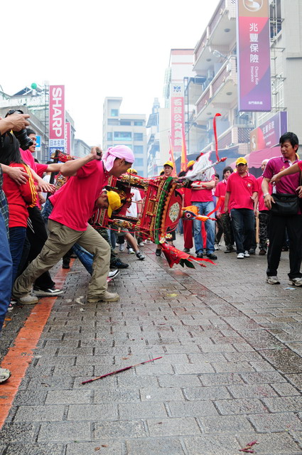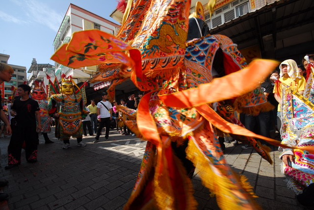 玩到這時候,已是下午四點多鐘,街道兩旁觀望的人潮逐漸退去,只剩幾聲零星稀疏的鞭炮聲;各路陣頭的鑼鼓點子雖然還持續沒停,但聲音微弱多了,不再像中午時那般的震撼人心;隊伍的規模也明顯縮小,剩下的幾支旌旗也是東倒西歪顯得有點零落,這個光景,提醒我是到了曲終人散的時候。