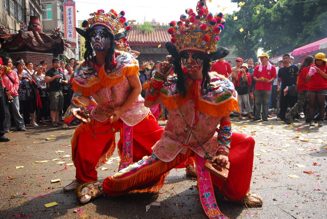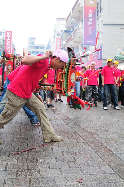 在外武廟的廟口前,我蹲在乩童的腳邊拍照,和前來禮拜的陣頭距離實在有點近,有幾次我真擔心八家將手中揮舞的兵器會掃到我!