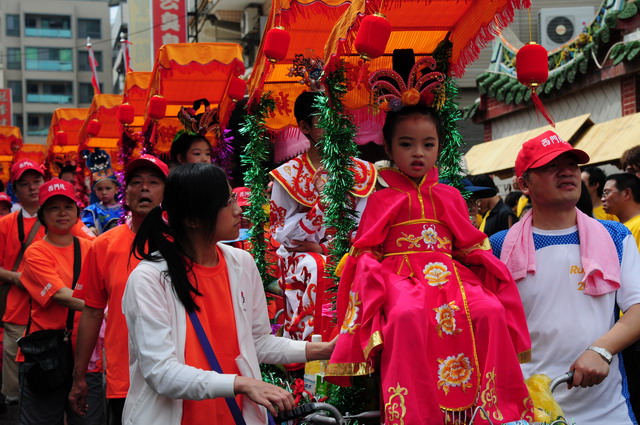 小孩坐上藝閣的花車,辛苦的爸爸媽媽要隨侍在側!