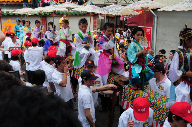 西境的「藝閣」,又名「抬閣」,是一種中國傳統民俗技藝表演,常見於迎神賽會。一般由小孩子裝扮成各種歷史人物,坐在製作精美的閣子裡,由人抬著或搭載於車子上遊行街頭。以上是資料上如此寫的,但我對照一下照片,我分不出「花車」和「藝閣」兩者之間有什麼大不同?