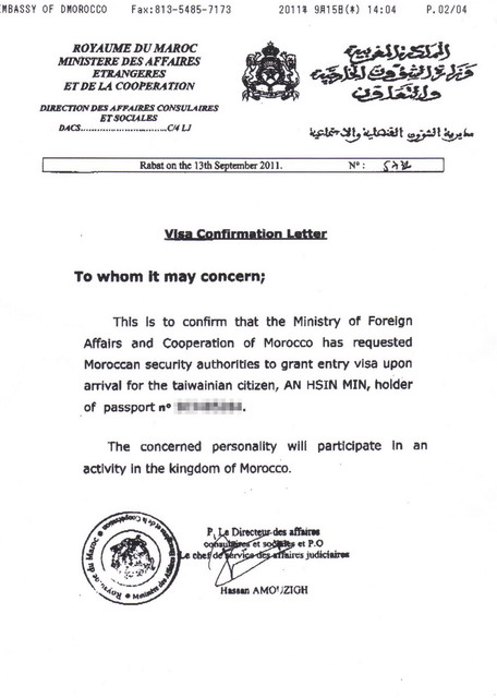 a. 申請這份「簽證確認信」的作業時間(Lead time)會是多久呢?不一定,我的第一次申請差不多是六個禮拜,第二次則不到四個禮拜就收到傳真。這是當資料無誤、作業順暢的狀況下的結果,根據東京友人轉述摩洛哥使館作業人員的經驗,他說:也常有收不到摩洛哥外交部核准的「簽證確認信」的時候,你所寄出的申請或許從此就石沉大海,當局不會主動告訴你被拒絕的原因。