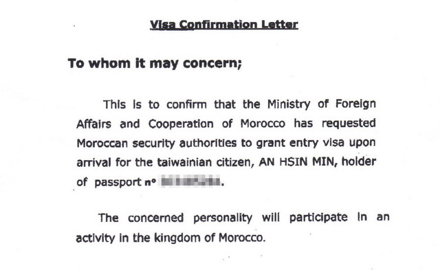 「簽證確認信」內容單純,主要的意思就是告訴摩洛哥邊境或機場的國安人員說,看到持此文件的人,讓他入境。