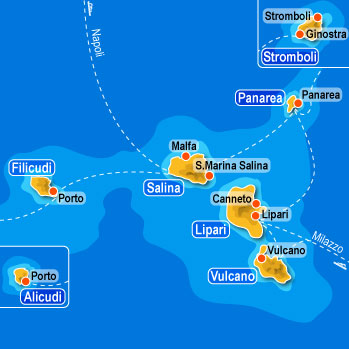風神的家鄉---伊奧利亞群島位於地中海的第勒尼安海(Tyrrhenian Sea)海域內,行政區則屬於西西里的梅西拿省。前往伊奧利亞群島唯一的方式是搭船,最主要的港口是梅西拿省境內的米拉佐港。一年四季,一個禮拜7天,每天都有渡輪(ferries)或水翼快艇(hydrofoils)往返諸小島,但船支往返的頻率則隨季節而異:夏季密度高,一天當中將近10班船,在其他季節則逐漸遞減,在冬季,海象惡劣,甚至經常有長期與外界隔絕的狀況,但在夏季的旅遊旺季時則增加了來自義大利本土的拿坡里(Napoli)、雷裘迪卡拉布里亞(Reggio di Calabria),或是自西西里自己的梅西拿港、巴勒摩港等地的渡輪或水翼快艇前往。屆時各島嶼之間來往的水翼船、渡輪、漁船、遊艇則佈滿整個海域。船班的訊息可以查以下網站: