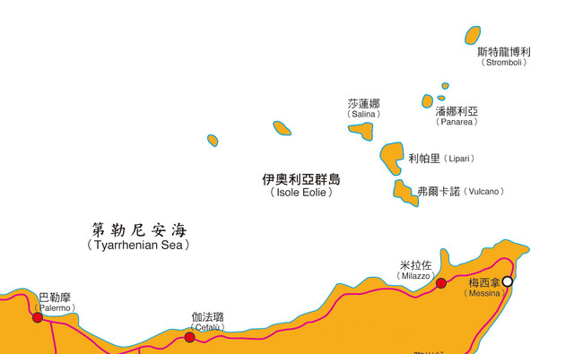 這趟旅行中,為了觀看火山噴發而前往伊奧利亞群島(Isole Eolie)可算是我最大膽、最冒險的決定。我之所以說「大膽、冒險」並非指登山的艱難程度,而是指此次前去「風神家鄉」之路充滿難以掌控的變數。依照荷馬《奧德賽》的記載,伊奧利亞群島正是風神埃俄羅斯(Aeolus)的家鄉,而伊奧利亞群島(Isole Eolie)是指散佈在西西里東北方的第勒尼安海(Tyrrhenian Sea)海域內,主要是由七個火山島所組成的島群。如下圖所示: