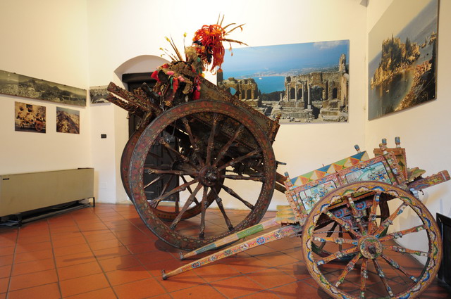 在陶米納的遊客中心展示室中有這一輛精緻華麗的傳統馬車(顏色較深的那一輛),車身、車輪、車輻全是由硬木所造,車體表面精雕細琢,有繁複的雕刻,保存得非常完好。據遊客中心的接待人員介紹這輛車平日保存在這裡供人參觀,只有在重大的節慶時才會推出來由駿馬拉著遊街。她要我們低下身鑽進車身下去仔細尋找,在眾多的蟲魚鳥獸人物的木雕中去找尋一座墨索里尼的半身雕像,原來,這輛車是在墨索里尼初次來訪陶米納時為他所造的,只是不懂為何要把他的肖像放在這麼不起眼的地方。